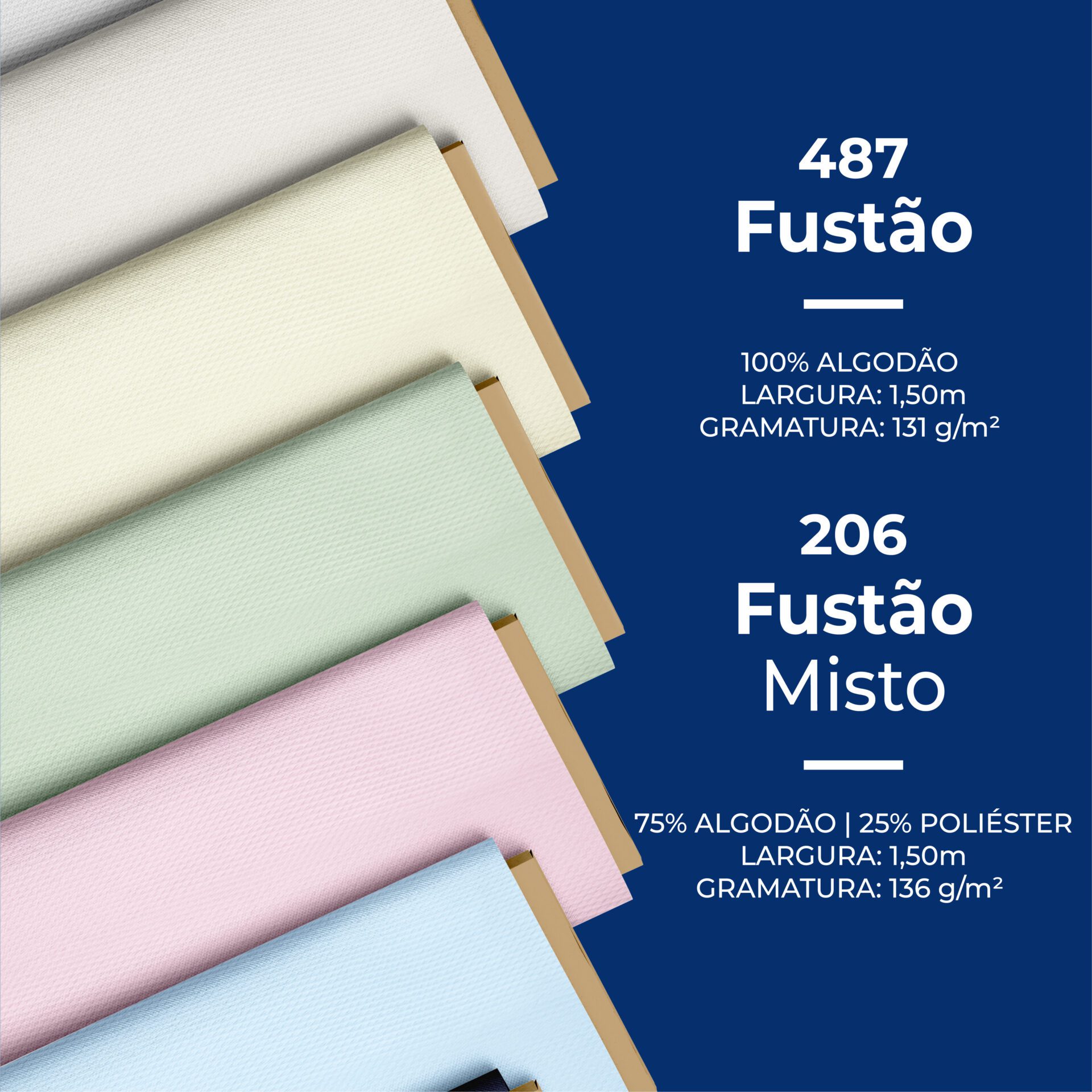Fustão Misto – 75% Algodão | 25% Poliéster, largura 1,50m, gram/rend: 136g/m²